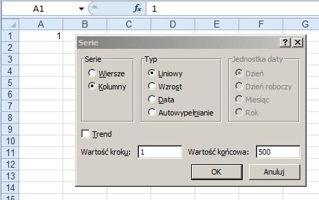 Liniowy, czyli przyrost liniowy; każdy element będzie większy od poprzedniego o wartość podaną w polu „Wartość kroku”.