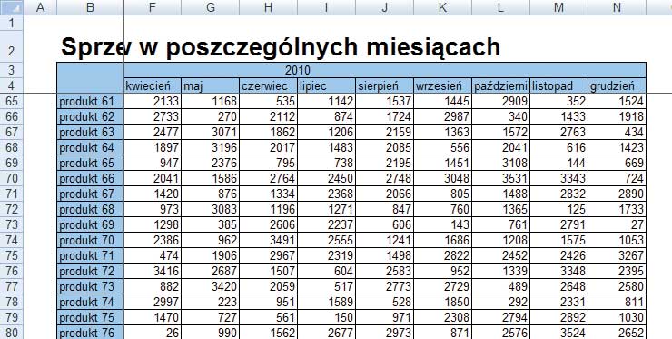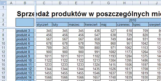 Aby zablokować w naszym przypadku (Rysunek 1) wiersz z miesiącami oraz kolumnę z produktami, należy stanąć kursorem w pierwszej komórce poniżej wiersza i kolumny do zamrożenia – w naszym przypadku jest to kolumna C5. Ekran z przewiniętymi w prawo kolumnami i w dół wierszami prezentuje Rysunek 4.