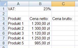 Do komórki C4 wprowadź formułę: =cena*vat;