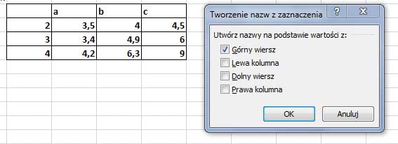 Tworzenie nazwy z zaznaczenia. Można w wygodny sposób tworzyć nazwy z istniejących etykiet wierszy i kolumn, zaznaczając komórki w arkuszu.