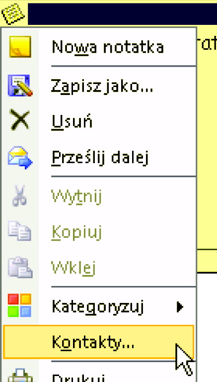 W przypadku gdy notatki dotyczą konkretnych osób, Outlook daje możliwość przypisania notatki do kontaktu. Aby to zrobić należy otworzyć notatkę, kliknąć lewym przyciskiem myszki w lewym górnym narożniku okienka i wybrać polecenie Kontakty.