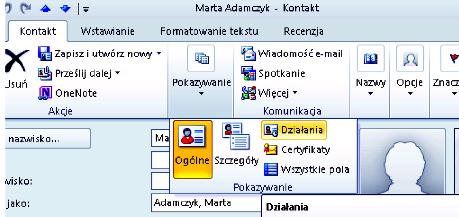 Aby zobaczyć, czy do kontaktu przypisane są jakiekolwiek notatki, należy otworzyć dany kontakt, kliknąć przycisk Pokazywanie, a następnie przycisk Działania. Outlook wyświetli wówczas notatki (i inne obiekty) skojarzone z kontaktem.