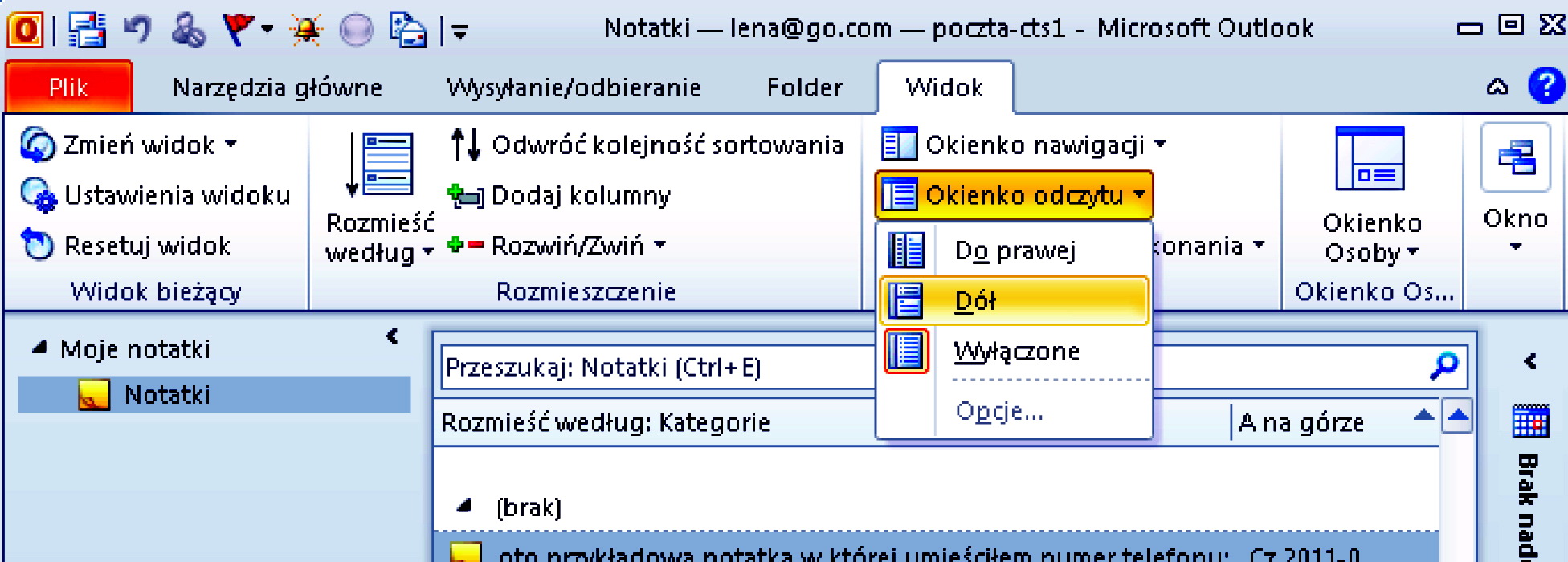 Okienko odczytu pozwala obejrzeć zawartość elementu w Outlook’u bez otwierania tego elementu. Domyślnie okienko jest przy notatkach wyłączone, ale można je włączyć klikając w kartę Widok, wybierając polecenie Okienko odczytu, a następnie określając położenie.