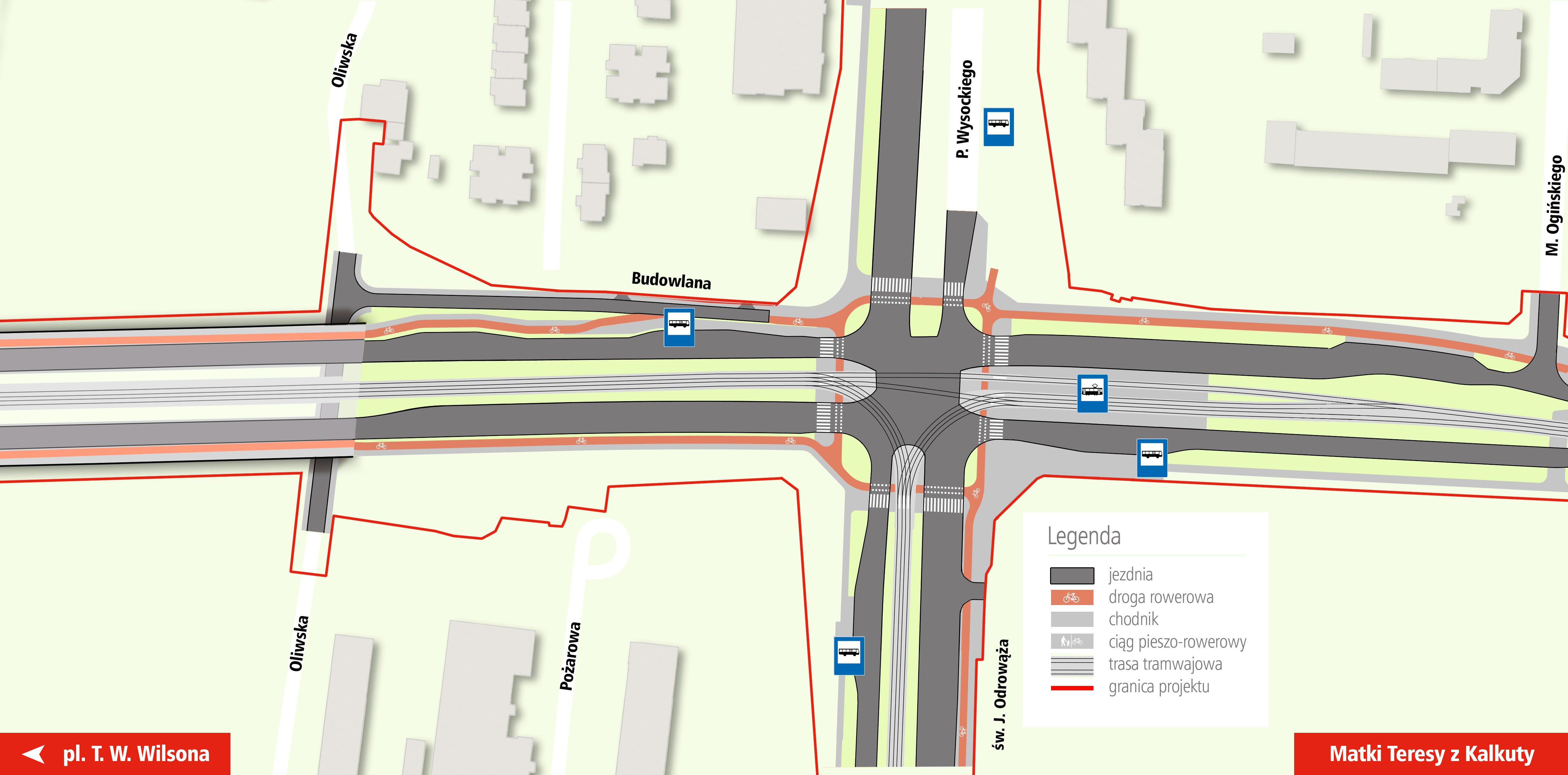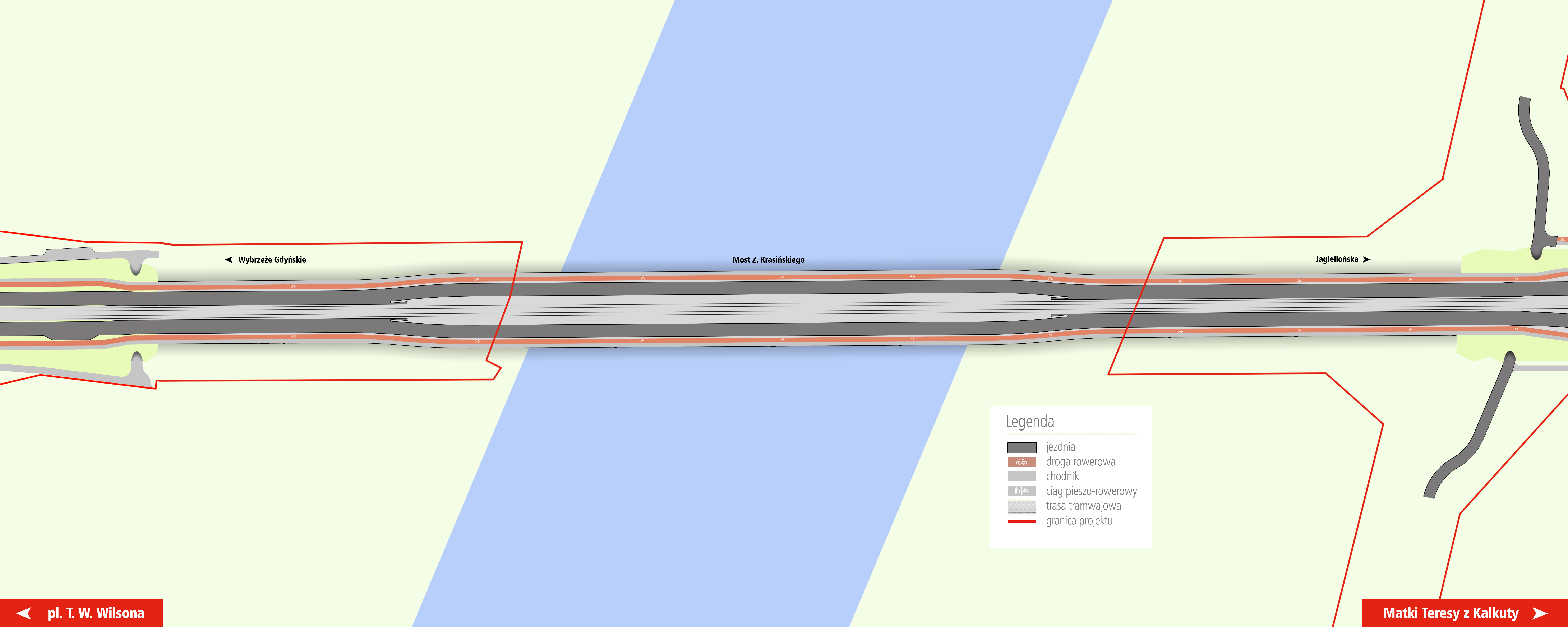 - Wydłużenie odcinka jezdni południowej pomiędzy skrzyżowaniem z ul. Odrowąża a przejazdem tramwajowym w rejonie włączenia nowej drogi w istniejącą ul. Matki Teresy z Kalkuty,