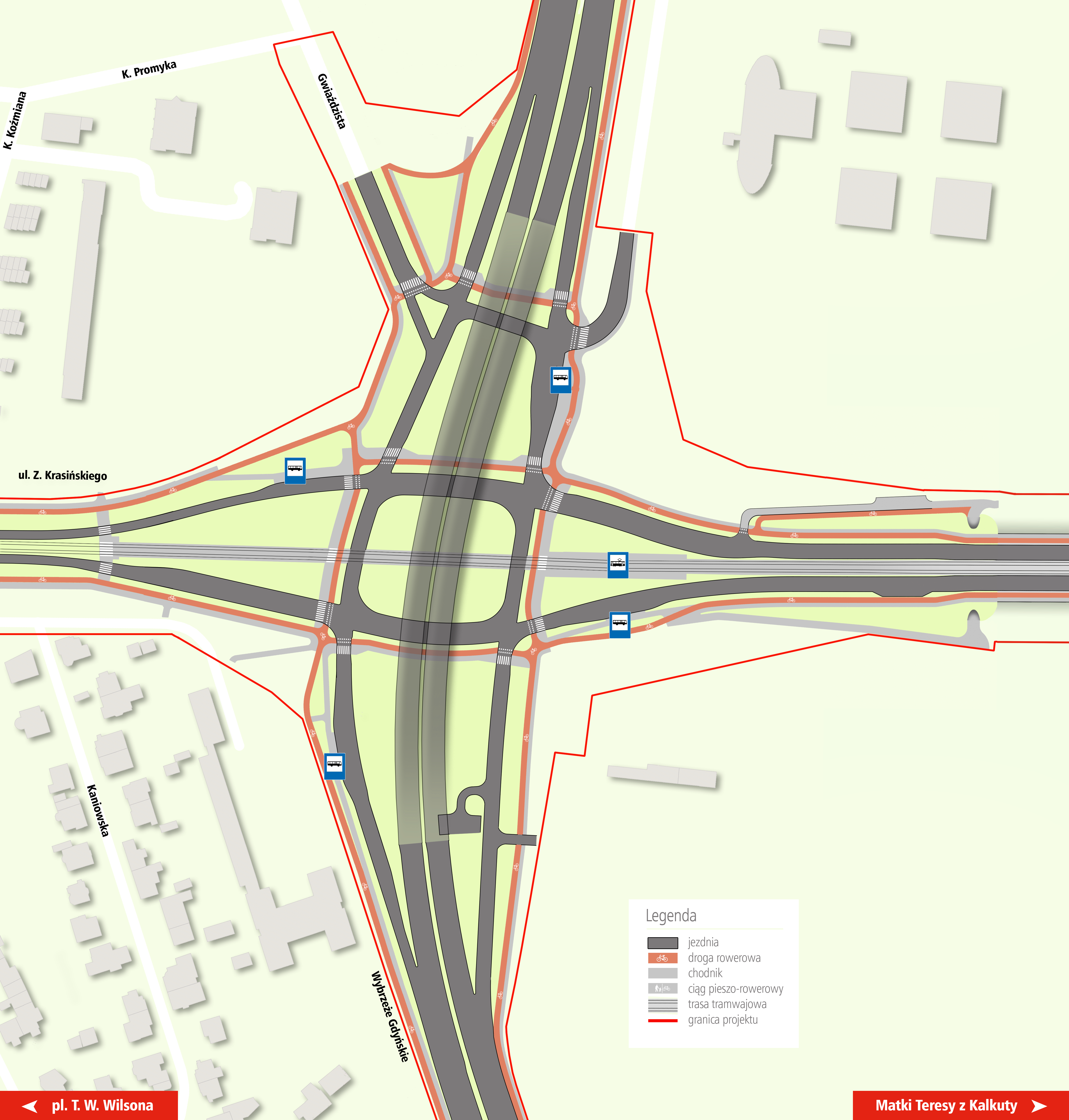 - Zmniejszenie powierzchni skrzyżowania na poziomie terenu przez przesunięcie jezdni znajdujących się w ciągu ul. Krasińskiego (północnej i południowej) o ok. 10 m w stronę linii tramwajowej,