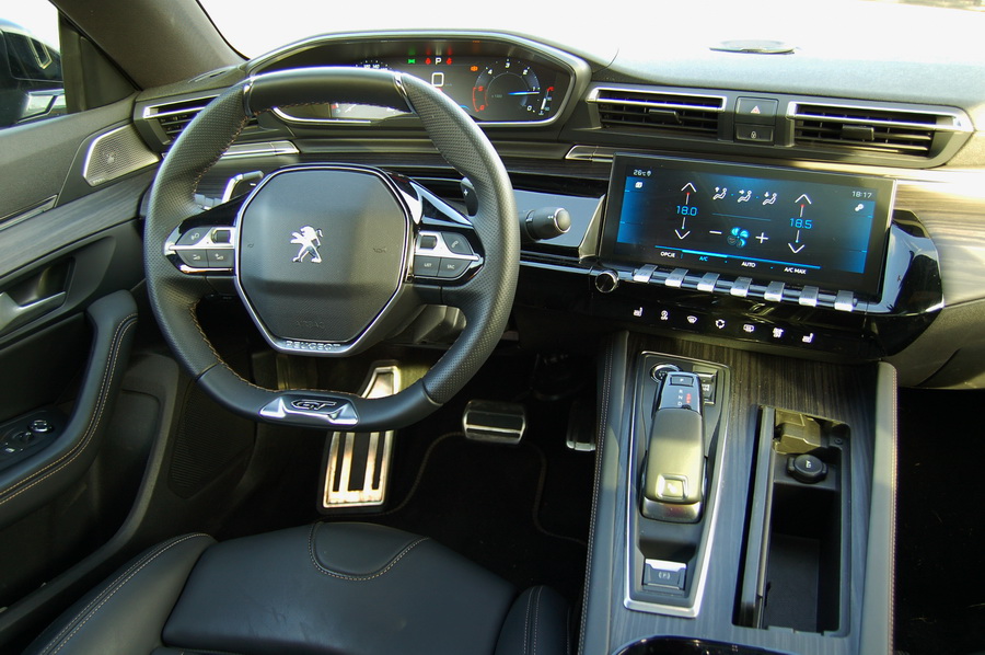 Podsumowując, zachwyt budzi każdy drobny element wnętrza: doskonalej jakości materiały, świetnie spasowane, duży ekran zamiast tradycyjnych zegarów, cyfrowo wyświetlający dowolne parametry jazdy lub funkcje. I tak można o Peugeocie 508 bez końca.