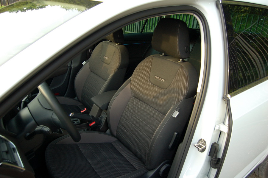 SCOUT jest za to obszerny i przygotowany do przewozu pięciu osób i ich niemałego bagażu. Jest dużo miejsca na nogi - kanapa z tyłu jest głęboka i wysoka; po zamontowaniu fotelika samochodowego z przodu nadal zmieści się wysoki facet. Auto jest natomiast dość niskie, w związku z tym wysokim osobom może lekko brakować przestrzeni ponad głowami.