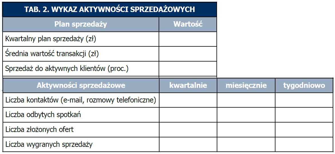 W tabeli 2. znajdziesz przykładowy wykaz aktywności sprzedażowych niezbędnych do zrealizowania kwartalnego celu sprzedaży.