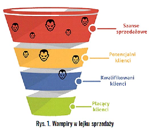 Wampir w sprzedaży B2B to potencjalny klient, który przebywa już dłuższy czas na jednym z poziomów lejka sprzedaży (rys. 1): chętnie spotyka się z handlowcem, zadaje mu pytania, zgłasza mnóstwo postulatów do oferty, ale nieustannie przesuwa datę decyzji zakupowej.