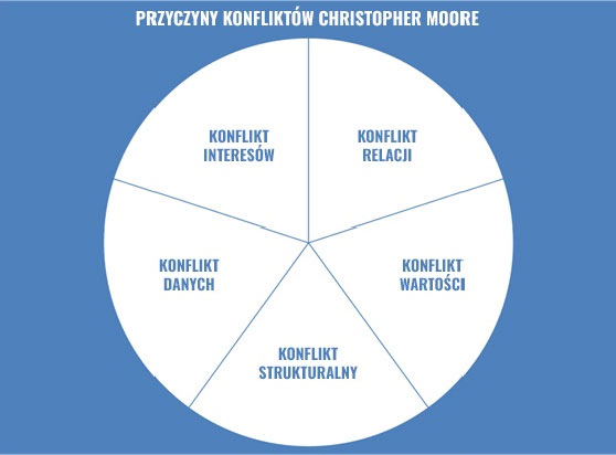 Na swoich warsztatach często obrazuję konflikt według metodologii Christophera Moore. Moim zdaniem przedstawił on jedno z najbardziej wszechstronnych podejść do zrozumienia i adresowania konfliktów. Jego model uwzględnia różne etapy i elementy konfliktu, a także wskazuje ścieżki do ich pokojowego rozstrzygania.