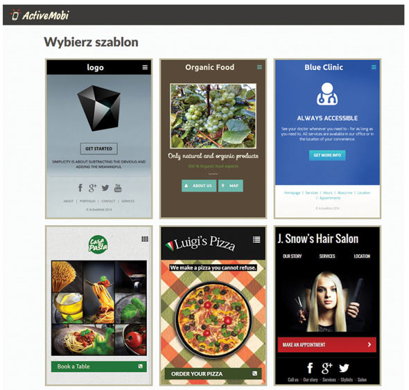 Aby rozpocząć pracę z kreatorem ActiveMobi, wejdź na stronę http://activemobi.pl/, a następnie kliknij przycisk Wypróbuj za darmo. Zostaniesz przeniesiony do biblioteki 21 unikalnych szablonów, przygotowanych z myślą o różnych branżach, które jednak możesz całkowicie zmodyfikować, dostosowując do swoich potrzeb.