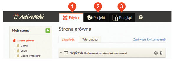 1. zakładka “Edytor”  – służy do zarządzania stronami i ich treścią