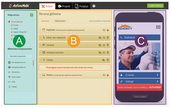 Po wybraniu szablonu, na bazie którego będziesz chciał stworzyć stronę mobilną swojej firmy, wejdziesz do kreatora ActiveMobi – łatwego w obsłudze narzędzia o przyjaznym interfejsie.