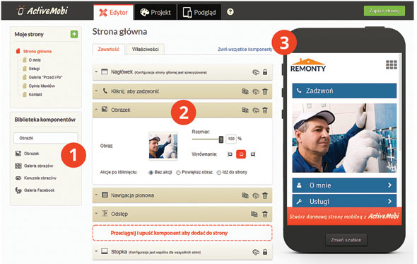 Tworzenie strony mobilnej w ActiveMobi polega na pracy z komponentami. Komponenty są to gotowe elementy służące do prezentacji treści, np. nawigacje, obrazki, filmy, czy teksty, z których będziesz budował stronę. Drugim typem komponentów są elementy biznesowe, jak przyciski „kliknij, aby zadzwonić” i „kliknij, aby napisać SMS”, przycisk do płatności PayPal, czy składania rezerwacji, formularz kontaktowy, a wreszcie mobilne mapy Google ze wskazówkami dojazdu. Za ich pomocą będziesz realizował swoje cele biznesowe.