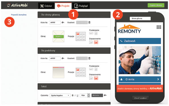 2. zakładka “Projekt” – służy do ustawienia tła stron, stylu czcionek, przycisków oraz widoku strony na tabletach.