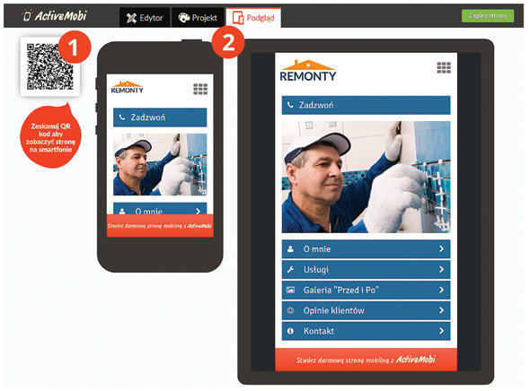 2. Podgląd strony – zobacz jak Twoja strona będzie wyglądała na smartfonie i tablecie. Tu możesz też przechodzić do kolejnych podstron i poruszać się po zawartości strony.