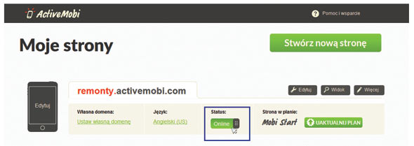 Aby Twoja nowo utworzona strona mobilna była widoczna w internecie, musisz zmienić jej status na „Online”. Przejdź do panelu, przesuń przycisk „Status” i gotowe.