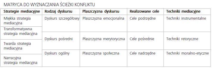 Dla naświetlenia tej kwestii podam przykład wyznaczania takiej ścieżki. Jeżeli mediator oceni, iż dany konflikt ma podłoże emocjonalne ludzi reprezentujących strony, na początek zanim zajmie się stroną merytoryczną problemu musi doprowadzić do zbliżenia stron. Wyznaczy wtedy strategię miękką, gdyż problemy emocjonalne trzeba traktować delikatnie i ingerować w jak najmniejszym stopniu. Dyskurs pośredni, aby nie wdawać się w zbyt szczegółową dyskusję, płaszczyznę emocjonalną, bo na takiej występuje konflikt, oznaczy cel jako pośredni, gdyż konflikt emocjonalny nie jest głównym celem tej sprawy i zastosuje techniki moralno-etyczne, gdyż takie najczęściej mają odniesienie do spraw emocjonalnych. Jeżeli doprowadzi już do zbliżenia emocjonalnego przedstawicieli stron, powróci do strategii twardej. Wybierze dyskurs szczegółowy, płaszczyznę merytoryczną, oznaczając cel, jako nadrzędny. Zastosuje techniki retoryczne, aby rozwiązać główny problem negocjacji. Pomimo tego, wydaje się to dość skomplikowaną sprawą, jednak dla wprawnego mediatora poruszanie się po takiej matrycy nie stanowi żadnego problemu i jest przy tym bardzo pomocnym narzędziem.