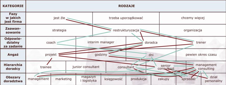 Aby zwizualizować Państwu paletę możliwości konfiguracji zespołu doradczego skorzystałam z instrumentu pracy kreatywnej, tzw. skrzynki morfologicznej. W pionie uwzględnione są różne kategorie potrzebne do dokonania wyboru, z kolei w poziomie poszczególne kategorie rozbite na rodzaje. Liczba rodzajów jest różna dla różnych kategorii. Definiując w poszczególnych kategoriach jeden lub więcej rodzaj do uwzględnienia rysujemy siatkę linii w dół. Jeśli dodamy w poszczególnych rodzajach odpowiednie mierniki, jak np. ceny, ilości, itp., to na podstawie powstałej siatki w bardzo prosty sposób możemy skalkulować cały projekt. A także sporządzić kalendarium (timetable) projektu i wyznaczyć kamienie milowe. Możemy też dość dokładnie określić moment, kiedy powinny być widoczne konkretne rezultaty realizacji projektu.