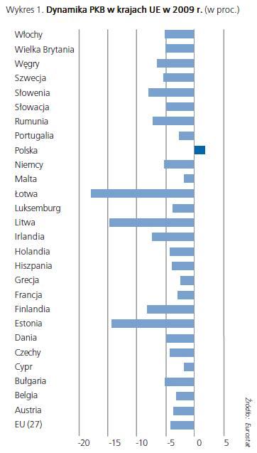 Odpowiedzialne za taki stan rzeczy są m.in. dobre wskaźniki gospodarcze. Pomimo znacznego spadku PKB w porównaniu z rokiem 2008 (5,1 proc. do 1,8 proc.) Polska, jako jedyny kraj w Unii Europejskiej, osiągnęła dodatnie tempo wzrostu PKB w 2009 r. (wykres nr 1). Przyczynami spowolnienia był m.in. spadek popytu wewnętrznego o 0,9 proc. w skali roku (wzrost o 5,5 proc. w 2008 r.). Motorem wzrostu okazał się dobry bilans handlowy. Wprawdzie zarówno import, jak i eksport spadały, ale import znacznie szybciej (18,6 proc. do 11,3 proc. w II kw. 2009 r.).