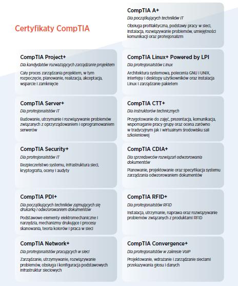 Warto zwrócić uwagę na szeroki przekrój certyfikacji CompTIA – przez poziomy zaawansowania (np. dla pełnej certyfikacji CompTIA Network + zalecana jest wiedza praktyczna, zdobyta w toku min. dziewięciomiesięcznej pracy w administrowaniu rozwiązaniami sieciowymi), jak przez jej szeroki zakres tematyczny (certyfikacja z bezpieczeństwa czy z zarządzania serwerami).