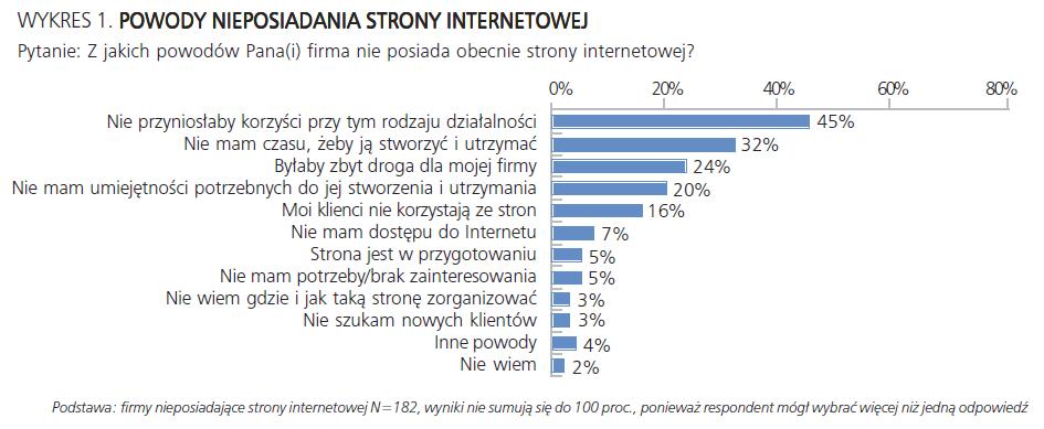 Na samodzielne przygotowanie strony internetowej zdecydowałoby się 36 proc. firm, blisko dwie trzecie (64 proc.) odrzuca taką ewentualność, argumentując to brakiem umiejętności. Dodatkowo, polscy przedsiębiorcy nie wykorzystują możliwości jakie daje posiadanie strony internetowej. Tyko 12 proc. prowadzi sklep internetowy, 14 proc. używa forum, a 15 proc. korzysta z opcji video i innych multimediów. Większość firm posiada natomiast na swojej stronie dane kontaktowe (98 proc.), prezentuje za jej pośrednictwem ofertę (92 proc.) i galerię zdjęć (80 proc.).