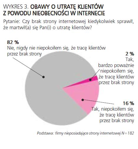 Na razie jednak duży procent przedsiębiorców pozostających bez strony internetowej (30 proc.) nie widzi potrzeby jej posiadania. 1/4 nie wie ile kosztuje i ile czasu zajmuje jej stworzenie. Ośmiu z dziesięciu przedsiębiorców nie obawia się, że brak strony internetowej może wiązać się z utratą potencjalnych klientów (wykres nr 3).