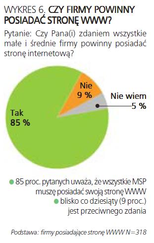 Jak wskazują wyniki badania TNS OBOP, ponad 80 proc. przedsiębiorców posiadających stronę internetową uważa, że to standard w dzisiejszym świecie (wykres nr 5). Większość z nich (70 proc.) twierdzi, że w ten sposób łatwiej dotrzeć im do nowych klientów, a prawie połowa, że pozwala to na utrzymanie kontaktu z klientami dotychczasowymi. Dodatkowo aż 85 proc. badanych uważa, że wszystkie małe i średnie firmy powinny posiadać swoją stronę WWW (wykres nr 6).