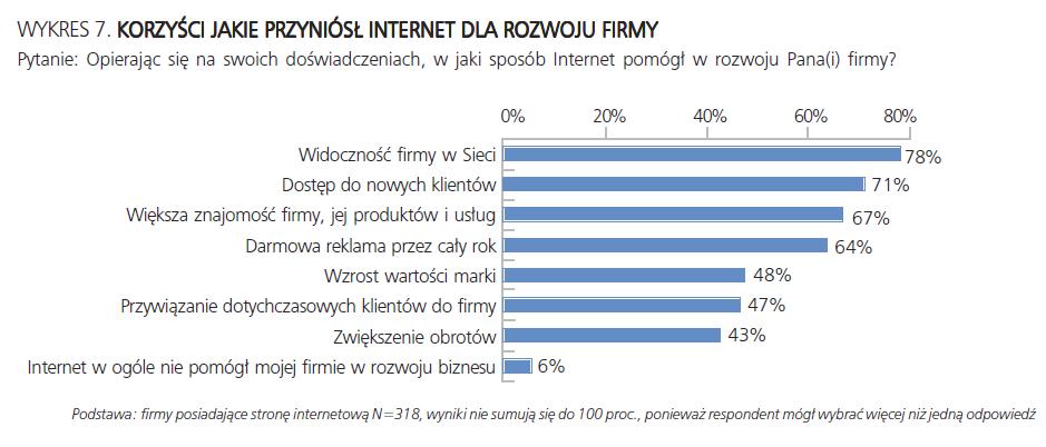 Wśród korzyści jakie przyniósł Internet, firmy najczęściej wymieniają zwiększenie widoczności marki (78 proc.), dostęp do nowych klientów (71 proc.) oraz wzrost znajomości firmy i jej oferty (67 proc.). Przedsiębiorcy posiadający stronę internetową planują jej rozbudowę (38 proc.) i zwiększenie aktywności reklamowej w Internecie (29 proc.). Tylko 6 proc. przedsiębiorców obecnych w Internecie uznała, że sieć nie przyniosła im żadnych korzyści (wykres nr 7).