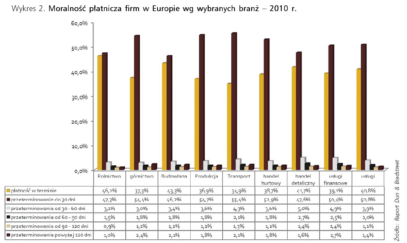 Ogółem w Polsce w 2010 r. zaledwie co trzecia faktura opłacona była w terminie. Na przestrzeni ostatnich trzech lat moralność płatnicza w naszym kraju spadła o ponad 17 proc. Tym samym zaledwie 55 proc. należności opłacanych jest w uzgodnionym terminie. Dodatkowo, blisko 8 proc. należności regulowanych jest po 120 dniach. Tak wysoki odsetek plasuje nasz kraj w ogonie Europy. Dane statystyczne pokazują, że w naszym kraju firmy (niezależnie od wielkości) w jednakowym stopniu opóźniają swoje zobowiązania finansowe.