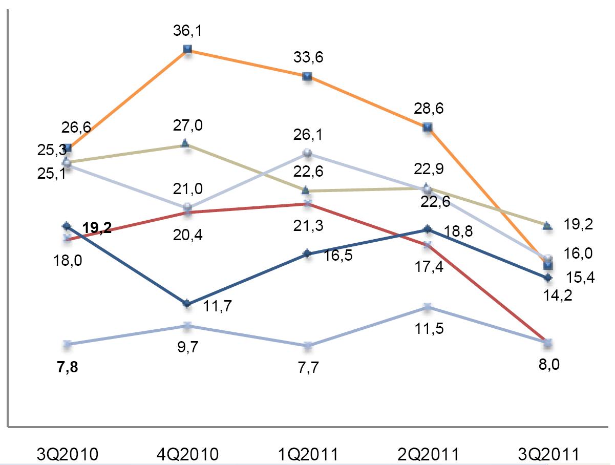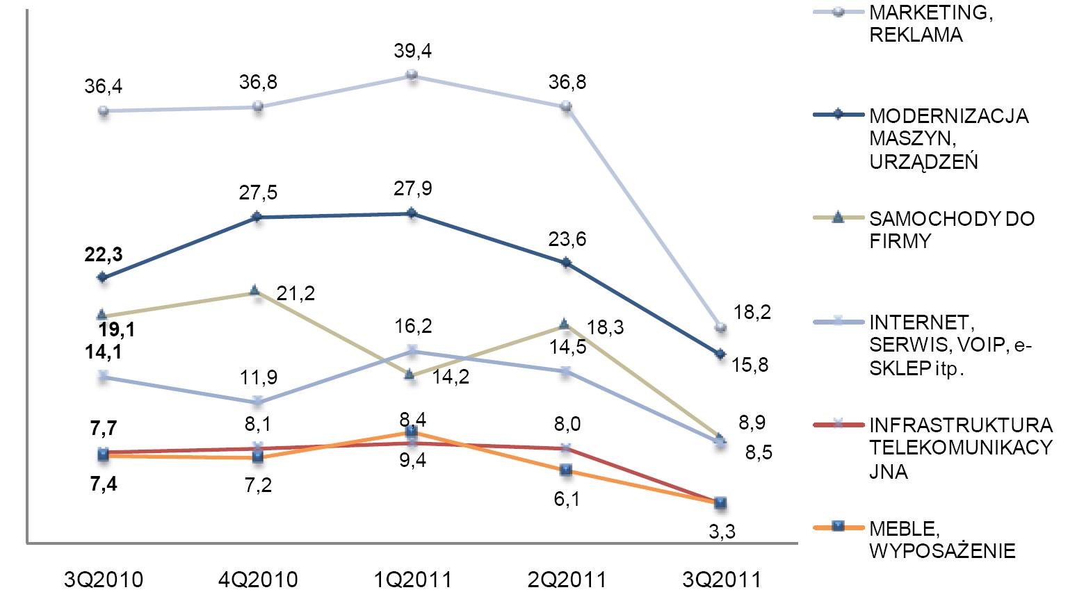 Analizując plany inwestycyjne dla poszczególnych obszarów w ujęciu historycznym otrzymujemy porównanie, jak znacząco spadek nastrojów przekłada się na degresję planów zakupowych. Szczególnie zauważalne cięcia dotyczą obszaru kompetencji, tj. zakupów nieobowiązkowych szkoleń dla pracowników, który z 33,6 proc. na początku roku zniżył się do 16 proc. Za spadki odpowiedzialny jest nie tylko sezon urlopowy, ile redukcja nakładów na szkolenia dotowane w ramach programu unijnego EFS, których pik przypadł na lata 2009-2010. Przedsiębiorcy niechętnie inwestują w szkolenia także wówczas, gdy koszt w całości ma obciążać firmę. W trzecim kwartale uzyskujemy równocześnie mocny spadek wydatków na marketing i reklamę. Choć relatywnie – na tle innych obszarów – marketing wypada dobrze (18,2 proc. będzie inwestować), to spadek r/r jest 100-procentowy, a Q/Q 18,6-proc. Jak wiadomo, w małych firmach, jak i w dużych przedsiębiorstwach pogorszenie sytuacji w pierwszym kroku oznacza cięcia wydatków na reklamę. W związku z tym ewentualne utrzymanie trendu spadkowego w tym obszarze w czwartym kwartale będzie zapowiedzią negatywnych działań w kolejnych obszarach, w tym najbardziej bolesnym, czyli zmniejszaniu zatrudnienia.