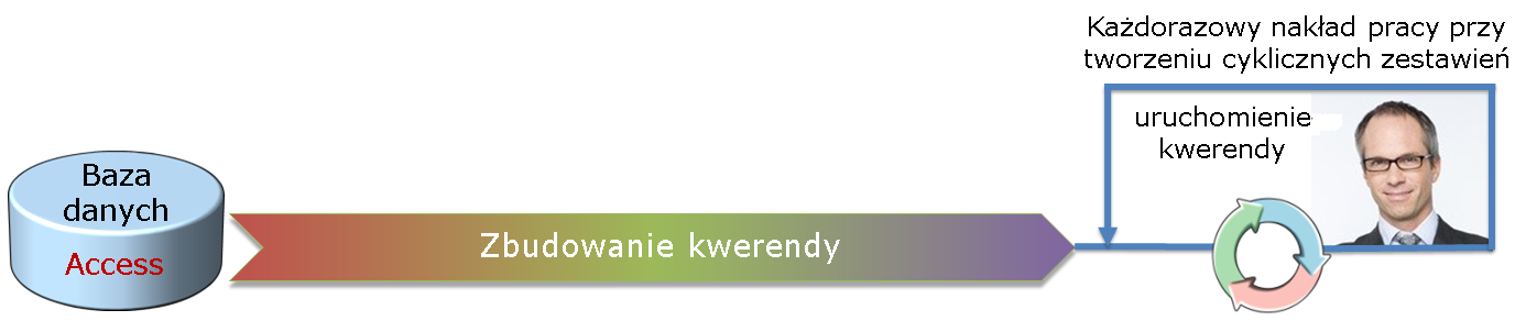 Po trzech dniach szkolenia: Pan Janusz mógłby zbudować kwerendę w oparciu o dane w bazie danych, a po jej uruchomieniu mieć gotowe zestawienie. Z poniższego schematu wynika, że kwerenda koncentruje w sobie trzy etapy poprzedniego scenariusza budowania zestawienia, a dodatkowo przy ponownym budowaniu zestawienia tego typu nakład pracy został skrócony wyłącznie do uruchomienia zbudowanej kwerendy.