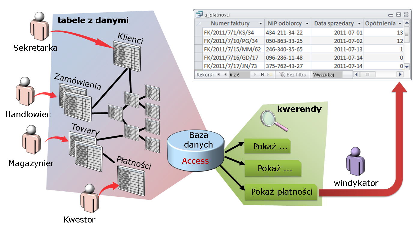 Różni użytkownicy bazy danych gromadzą w sposób uporządkowany dane w tematycznych tabelach w bazie danych. Gdy zachodzi potrzeba wydobycia tych danych, np. dla celów sprawozdawczych, z pomocą przychodzą kwerendy. W kwerendzie definiuje się co chcemy zobaczyć, tj. jakie informacje z jakich tabel bazy danych nas interesują. Każdorazowo w momencie uruchomiania kwerendy program Access odczytuje dyspozycje w niej zapisaną i zwraca pożądane dane z bazy. Dzięki temu mechanizmowi kwerendy automatycznie odzwierciedlają wszystkie zmiany dokonywane w tabelach bazy, a tym samym generowane zestawienia są zawsze aktualne. Po przygotowaniu odpowiedniej kwerendy, zestawienie z przeterminowanymi fakturami Pan Jan może generować nawet codziennie, poprzez kliknięcie odpowiedniej kwerendy.
