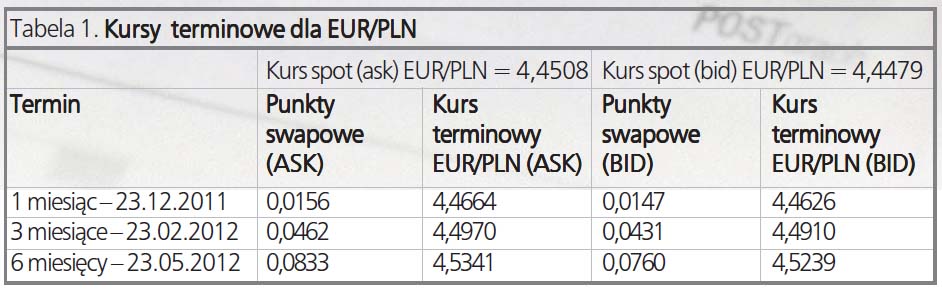 Jak widać w Tabeli 1, miesięczny kurs terminowy EUR/PLN jest obecnie o ok. 1,5 grosza wyższy niż dzisiejszy kurs spot. Aby dokładnie zrozumieć zasadę działania transakcji forward prześledźmy ją na przykładzie.