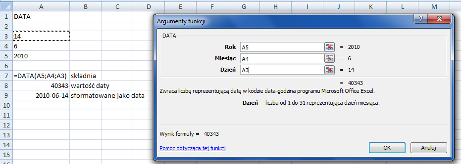 Funkcja DATA jest najbardziej użyteczna w formułach, w których rok, miesiąc i dzień są formułami, a nie stałymi.