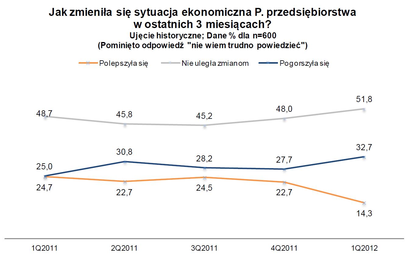 Równocześnie odsetek badanych negatywnie oceniających kondycję własnej firmy zwiększył się o 5 pkt proc. z 27,7 proc. do 32,7 proc. Przybyło też przedsiębiorców, którzy oceniają, że sytuacja w ich firmie nie uległa zmianom. Obecnie uważa tak ponad połowa badanych 51,8 proc.