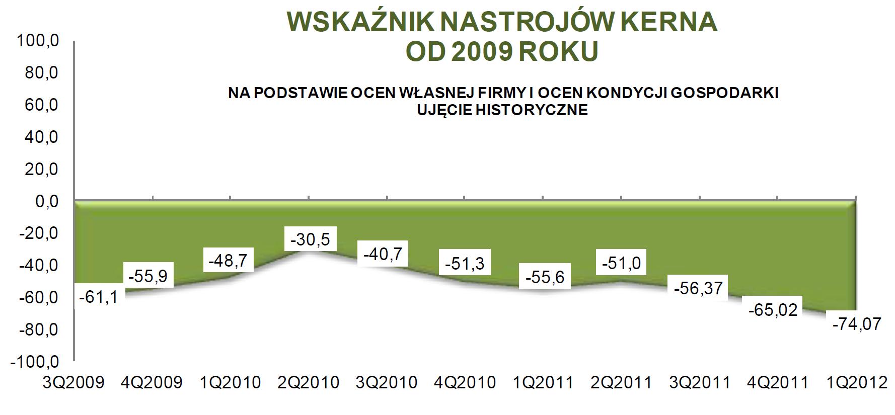 Wskaźnik nastrojów przedsiębiorstw KERNA spadł do poziomu -74,07 pkt i jest niższy o 9,05 pkt licząc kw/kw i najniższy od 2009 r. Na wskaźnik KERNA wpływają opinie przedsiębiorców dotyczące kondycji ekonomicznej kraju i firmy. Wliczane są oceny ostatnich trzech miesięcy i oceny najbliższej przyszłości wyrażane przez przedsiębiorców. Tak słabe nastroje to głównie efekt słabnącej oceny kondycji własnej firmy. Wskaźnik cząstkowy dla tego obszaru (ocena tego co działo się w 4 Q 2011 r. w firmie) spadł najbardziej, bo aż o 16,76 pkt kw/kw.
