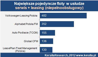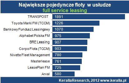 Z informacji Keralla Research wynika, że największe pojedyncze floty w kraju, obsługiwane dla jednego klienta w wariancie full service leasing, mieli w swoim portfelu w 2011 r. następujący oferenci: Transpost (1891 pojazdów), Toyota Marki (1226), Bankowy Fundusz Leasingowy (1070), Alphabet (975), BRE Leasing (907) oraz Corpo Flota (903).