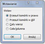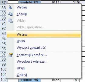 Wstawiać kolumny i wiersze można jeszcze w inny sposób, a mianowicie poprzez najechanie myszki na pasek kolumn czy też wierszy i wybranie prawego przycisku myszki. Następnie należy wybrać opcje wstaw. Warte podkreślenia jest to, iż wstawianie kolumn czy wierszy zawsze odbywa się w ten sposób, że zaznaczona kolumna przesuwa się w prawo i w ten sposób nowa kolumna pojawia się przed kolumną, na której stoimy z lewej strony, natomiast wg przypadku wierszy, wiersz, na którym aktualnie stoimy, przesuwa się o jedną pozycję w dół i tym samym jest wstawiony.