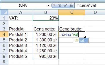 Do komórki C4 wprowadź formułę: =cena*vat;