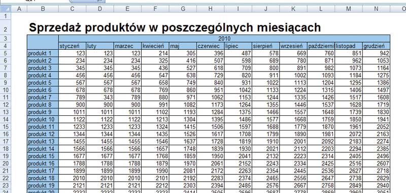 Aby zablokować w naszym przypadku (Rysunek 1) wiersz z miesiącami oraz kolumnę z produktami, należy stanąć kursorem w pierwszej komórce poniżej wiersza i kolumny do zamrożenia – w naszym przypadku jest to kolumna C5. Ekran z przewiniętymi w prawo kolumnami i w dół wierszami prezentuje Rysunek 4.