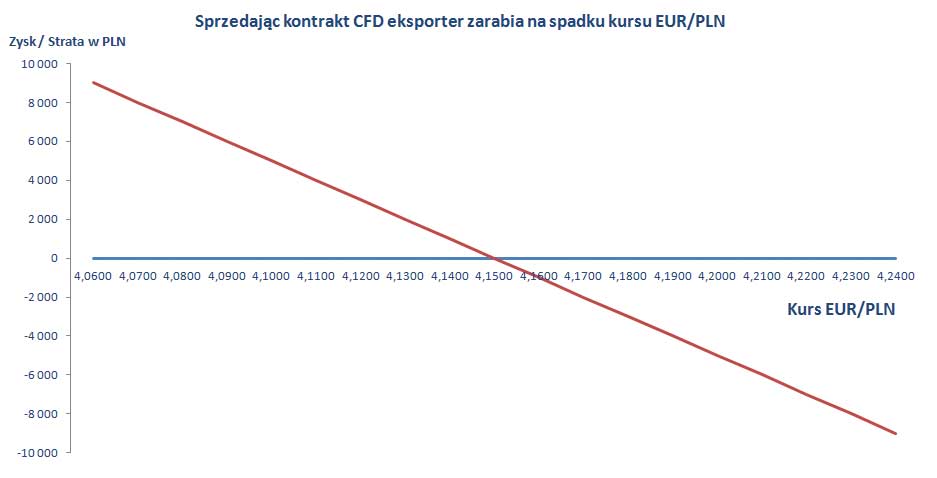W tym przypadku także można zastosować kontrakt różnic kursowych (CFD). Należy wybrać krótką pozycję, dzięki czemu spółka zarobi na spadku kursu EUR/PLN. Analogicznie do poprzedniej sytuacji, jeżeli przedsiębiorstwo otworzy krótką pozycję o wartości 1,5 lota (150 000 EUR) to spadek kursu o wartości 0,0001 PLN pozwoli zarobić spółce 15 PLN. Spadek o 30 groszy przyniesie zarobek wysokości 45 000 PLN.