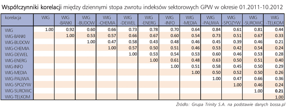 Jak wskazuje tabela, pomiędzy branżami na GPW, reprezentowanymi przez indeksy sektorowe, odnaleźć można niskie korelacje sprzyjające budowaniu zdywersyfikowanych portfeli. Dla przykładu, współczynnik korelacji między indeksem branży surowcowej i telekomunikacyjnej wynosi zaledwie 0,21. Ryzyko mierzone odchyleniem standardowym stóp zwrotu dla każdego indeksu z osobna wynosi odpowiednio 2,19 i 1,51 proc., natomiast tworząc portfel o równych udziałach, ryzyko wynosi 1,46 proc., czyli mniej niż oddzielnie dla każdej branży (minimalne ryzyko możliwe do osiągnięcia przez zmianę wag portfela bez stosowania krótkiej sprzedaży wynosi 1,36 proc.). Inwestor indywidualny nie musi znać ani mechanizmu, ani wzorów matematycznych stojących za tymi obliczeniami – ważne jest jednak to, aby pamiętał o podziale środków między instrumenty jak najmniej od siebie zależne.