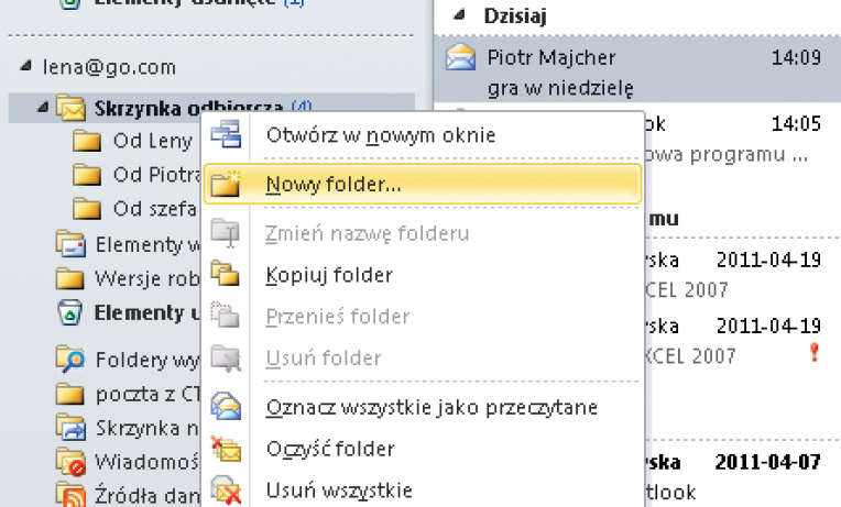 Aby utworzyć nowy folder należy kliknąć prawym przyciskiem myszki w miejscu, w którym nowy folder ma się znajdować (np. na skrzynce odbiorczej) i wybrać polecenie Nowy folder…