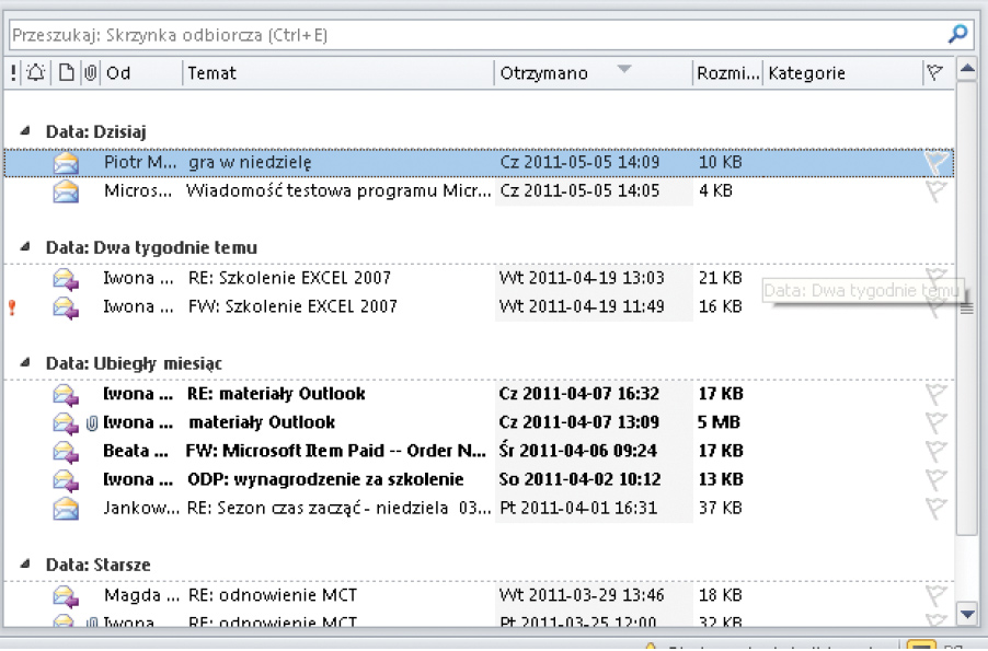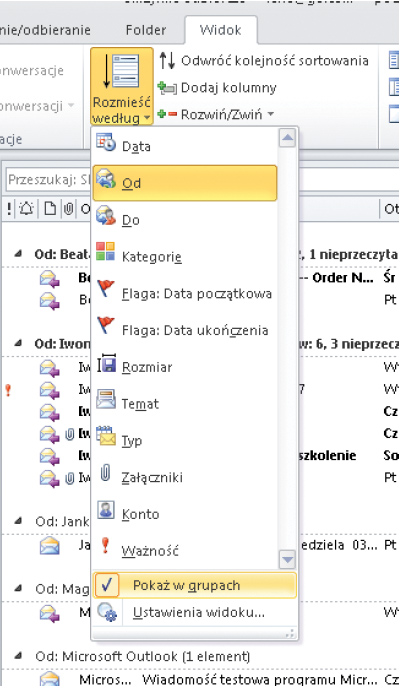 Outlook ma również domyślnie włączone grupowanie. To mechanizm, który grupuje wiadomości według wybranego kryterium na przykład według nadawcy albo daty otrzymania e-maila. Grupowanie jest włączone domyślnie także aby zobaczyć jego efekty wystarczy posortować dane według któregokolwiek pola. Wiadomości będą wówczas posortowane i pogrupowane. Na rysunku poniżej widać efekt posortowania wiadomości według pola Od rosnąco z włączonym grupowaniem.