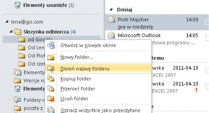 Jeśli zachodzi potrzeba zmodyfikowania albo usunięcia folderu, należy kliknąć na nim prawym przyciskiem myszki i wybrać odpowiednie polecenie.