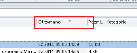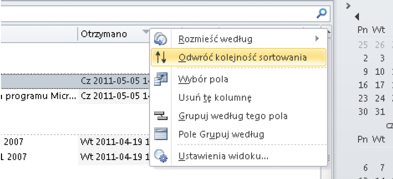 Symbol trójkąta przy nagłówku pola pokazuje, że wiadomości są sortowane według tego pola. Kolejność sortowania można zmienić klikając na nagłówku pola prawym przyciskiem myszki i wybierając polecenie Odwróć kolejność sortowania.