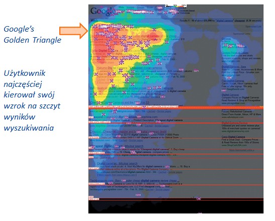 Większość użytkowników skupiała się na szczycie wyników wyszukiwania. Uwidacznia się także pewien kształt nazwany później Złotym Trójkątem Google (Google’s Golden Triangle). To właśnie to miejsce było w 2005 roku najcenniejszym obszarem w SERP-ie (strona z rezultatami wyszukiwania). Pierwsze wyniki budziły dużo większe zainteresowanie i zaufanie w porównaniu z reklamą Adwords.