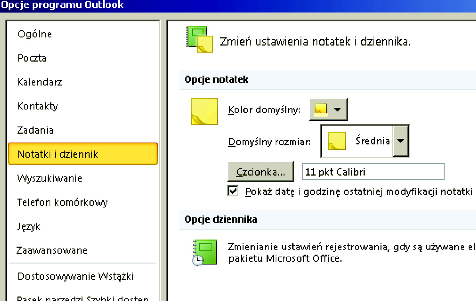 Outlook pozwala określić domyślne ustawienia dla nowych notatek, jak kolor, rozmiar i czcionka używana do wyświetlania treści. Ustawienia te są dostępne po kliknięciu w kartę Plik > Opcje > Notatki i dziennik.