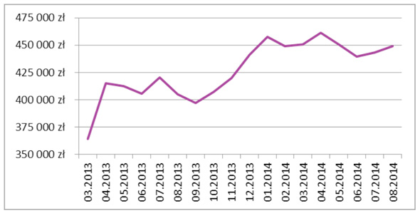 W sierpniu zdolność kredytowa liczona dla trzyosobowej rodziny wyniosła średnio 449 342 złotych, czyli o 5 889 złotych więcej niż miesiąc wcześniej. Najwyższą kwotę – 493 tys. złotych – oferował Bank BGŻ. O tysiąc złotych mniej kredytobiorcy mogli otrzymać w banku Pekao SA, a 471 tys. złotych, to maksymalna kwota kredytu w Banku Millennium. Średnia marża kredytu wyniosła 1,81%.